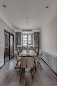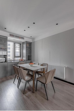 餐厅墙面同样用的是墙板材质,手感细腻且有丰富质感,一定程度上也掩盖了底部暖气片的突兀。岩板餐桌+造型餐椅的极佳组合,奠定了优良的餐厅基调。喊上一群朋友聚餐吃饭,也是非常地合适。