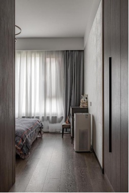 床面的另一头,则相应添置了简易置物柜,灵活放置一些极小物件。墙面同样用墙板做了装饰,增添更多格调。藉由将书房与主卧的隔墙内推,进而增加了一整组实木衣柜。