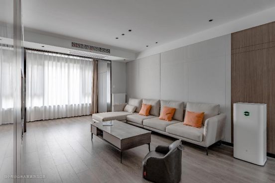 沙发背景墙用到硬包+墙板的碰撞设计。硬包表面为墙板吸塑,手感柔和细腻,但大面积运用难免单调寡淡,于是加以墙板的融合,用木纹点缀其上,增加整体层次感。