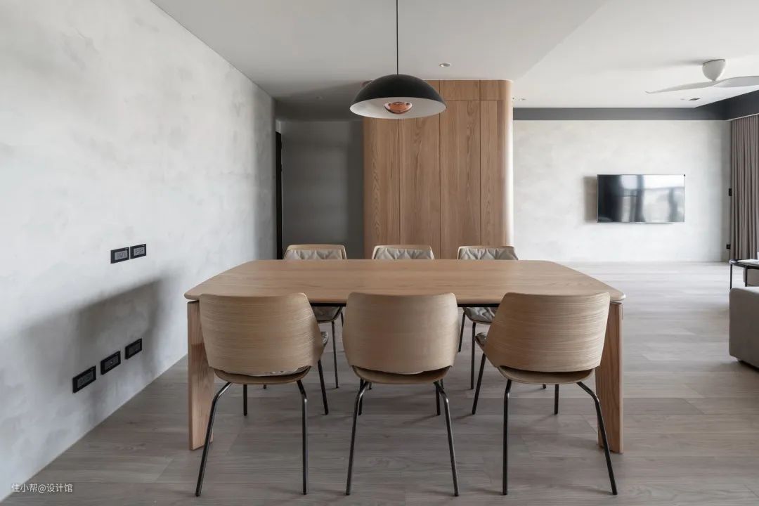 ▲餐厅后方的收纳柜也是原木纹理的材质,在灰色与木质感的空间布置下,给人以极简朴素的高级设计效果。