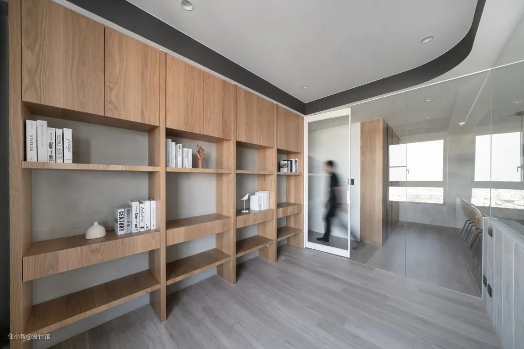 ▲书房以玻璃隔墙设计,与客厅、餐厅互通,订制一整面墙的书架,开放与封闭组合的书架,提供了灵活实用的收纳位置。