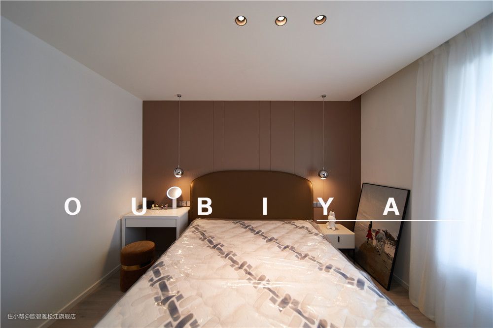 主卧室背景墙用硬包做装饰,棕色在白色的映衬下体现温馨的感觉,柔和的色调,不会显得混乱。同时又与客厅呼应,色彩统一。
