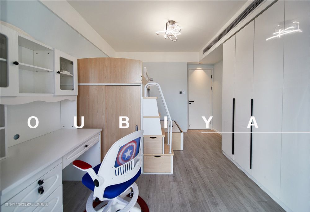 儿童房采用上下床的设计、通顶的大衣柜,为二胎预留了足够的居住和储物空间。利用玻璃拉门做卧室与阳台空间的隔断,既能保证儿童房的采光性与保温性,又能使空间通透明亮。