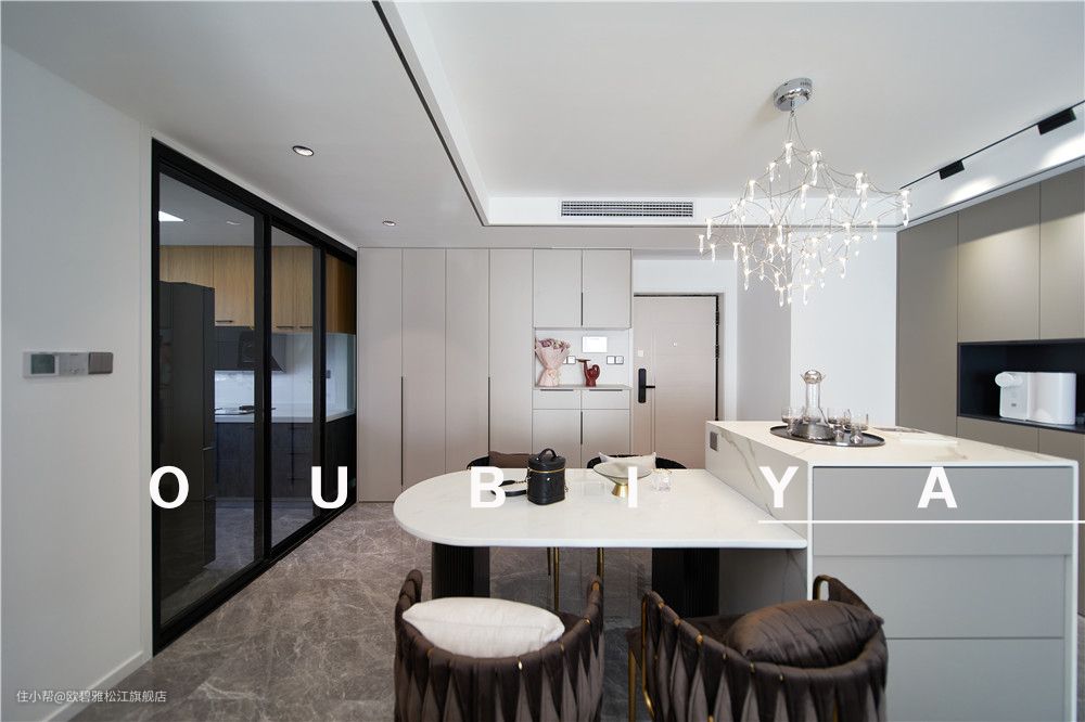 厨房利用轨道移门进行有效的空间分割和重组,这样一来,厨房在完全封闭式与开放式之间自由切换,不仅美观时尚还可以随时与外界互动。