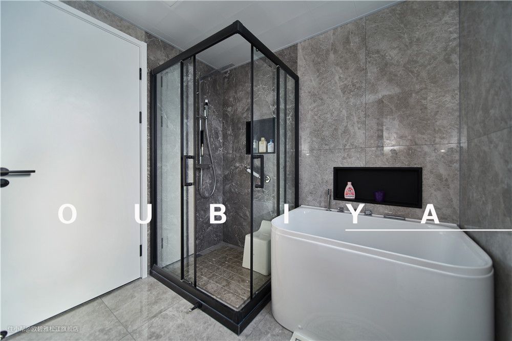 卫生间采用高级灰色的瓷砖,搭配黑色的线条,使得卫生间显得非常时尚有立体感。