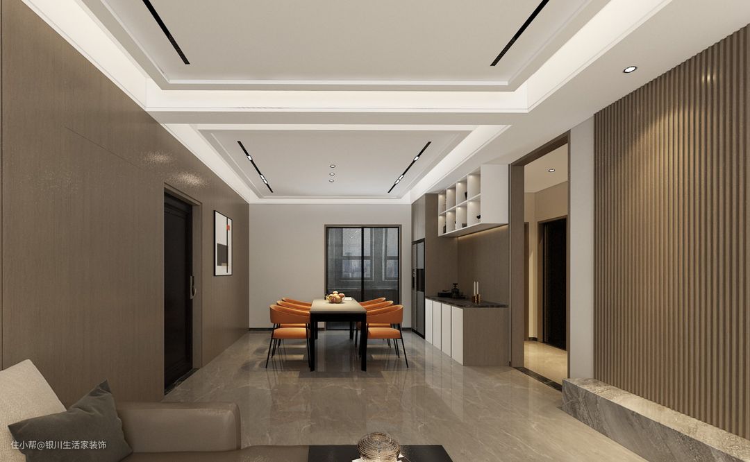 无主灯设计更加美观,靠近墙的位置做餐边柜,满足储物需求,不浪费居室空间。