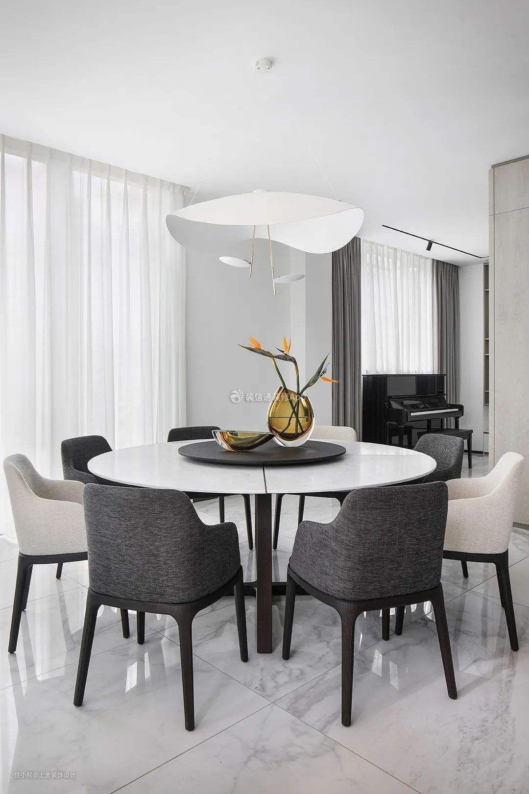 如果客厅、餐厅的家具都是方形或长方形的,圆桌面直径可从15cm递增。在一般中小型住宅,如用直径120cm餐桌,常嫌过大,可定做一张直径114cm的圆桌,同样可坐8-9人,但看起来空间较宽敞。如果用直径900cm以上的餐桌,虽可坐多人,但不宜摆放过多的固定椅子。如直径120cm的餐桌,放8张椅子,就很拥挤。可放4-6张椅子。