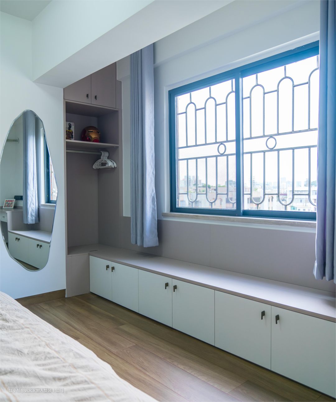 ②飘窗两侧开放柜如果飘窗比较大的话,也可以在飘窗两侧装上开放格,然后开放格上可以摆上公仔、摆饰品,也可以充当书柜摆放书籍,在提供方便的收纳的同时,还让卧室整体看起来简洁美观。