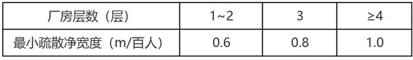 1)厂房内疏散楼梯、走道、门的各自总净宽度,应根据疏散人数按每100人的最小疏散净宽度不小于下表的规定计算确定。但疏散楼梯的最小净宽度不宜小于1.10m,疏散走道的最小净宽度不宜小于1.40m,门的最小净宽度不宜小于0.90m。当每层疏散人数不相等时,疏散楼梯的总净宽度应分层计算,下层楼梯总净宽度应按该层及以上疏散人数最多一层的疏散人数计算。