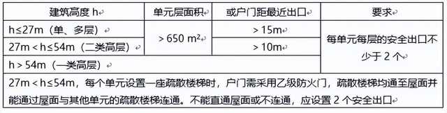 公共建筑“一般”超过50平方米就要有两个安全出口,但是住宅建筑设置一个安全出口的条件就宽泛得多了,一般单多层和二类高层建筑每层要650平方米以上,或疏散距离15米(单多层)或10米(二类高层)以上,才要求设置两个安全出口。以下这个表格,就是对住宅建筑安全出口设置数量的要求。