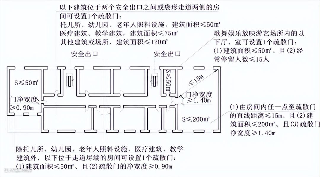 2)位于走道尽端的房间,建筑面积小于50㎡且疏散门的净宽度不小于0.90m,或由房间内任一点至疏散门的直线距离不大于15m、建筑面积不大于200㎡且疏散门的净宽度不小于1.40m。