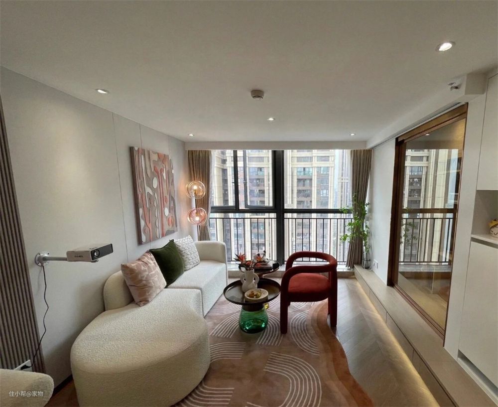 家里的客厅处于隔层下方,一张长沙发搭配小茶几,营造出精致轻奢的氛围感,而电视也被投影仪代替,让家里有个更加舒适放松的观影区。