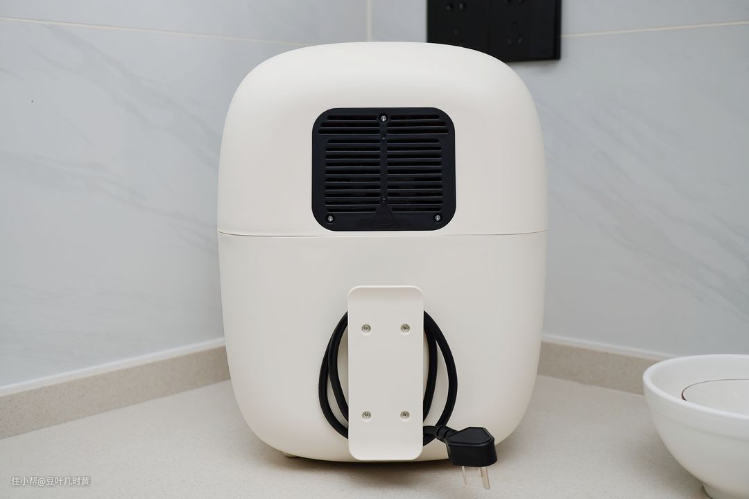 ▲主机背面顶部是散热孔,底部有绕线器,在需要对空气炸锅进行位置转移时,就不会出现线材的拖拽了,会方便很多。