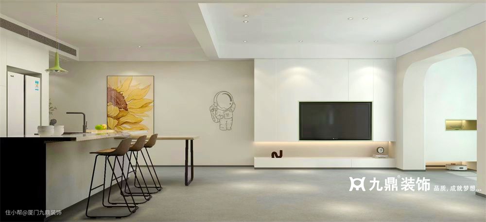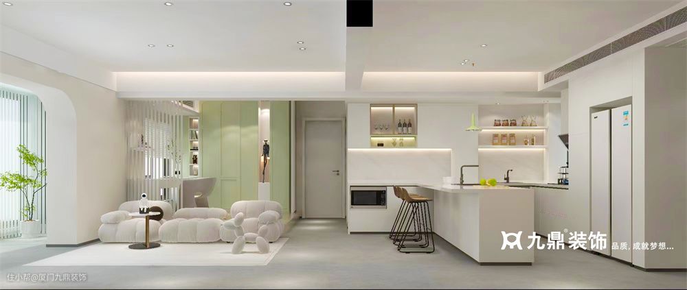 香港广场旺角楼|现代奶油色系,清简宁静的同时,也有家的温馨厦门九鼎装饰2023-02-11空间整体以素雅安静的低饱和色为主,客餐厅之间无界限,连接客厅和阳台的拱形门洞为空间添加复古气质,同时拉升整体的空间感。