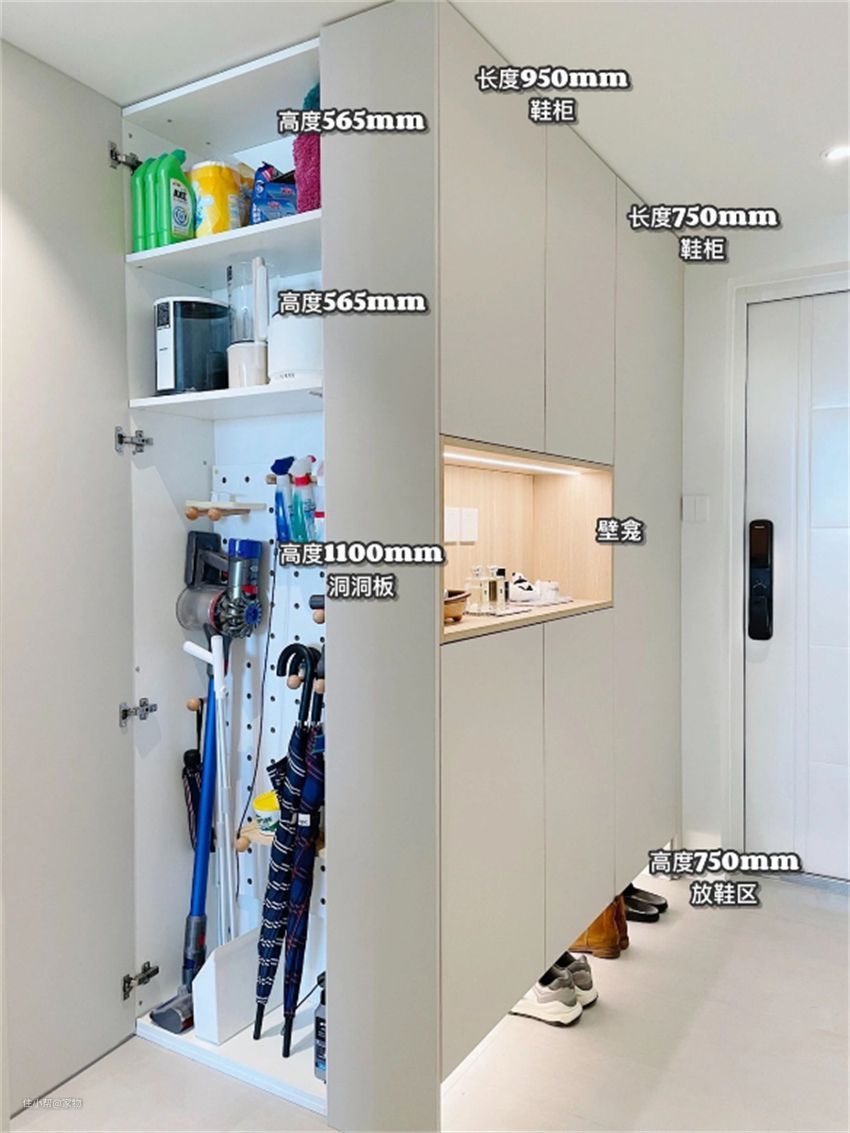 常见的一种方式是做家政柜,内置洞洞板悬挂清洁工具,方便取用。注意在内侧留插座位置,日后为清扫工具充电会很顺手。