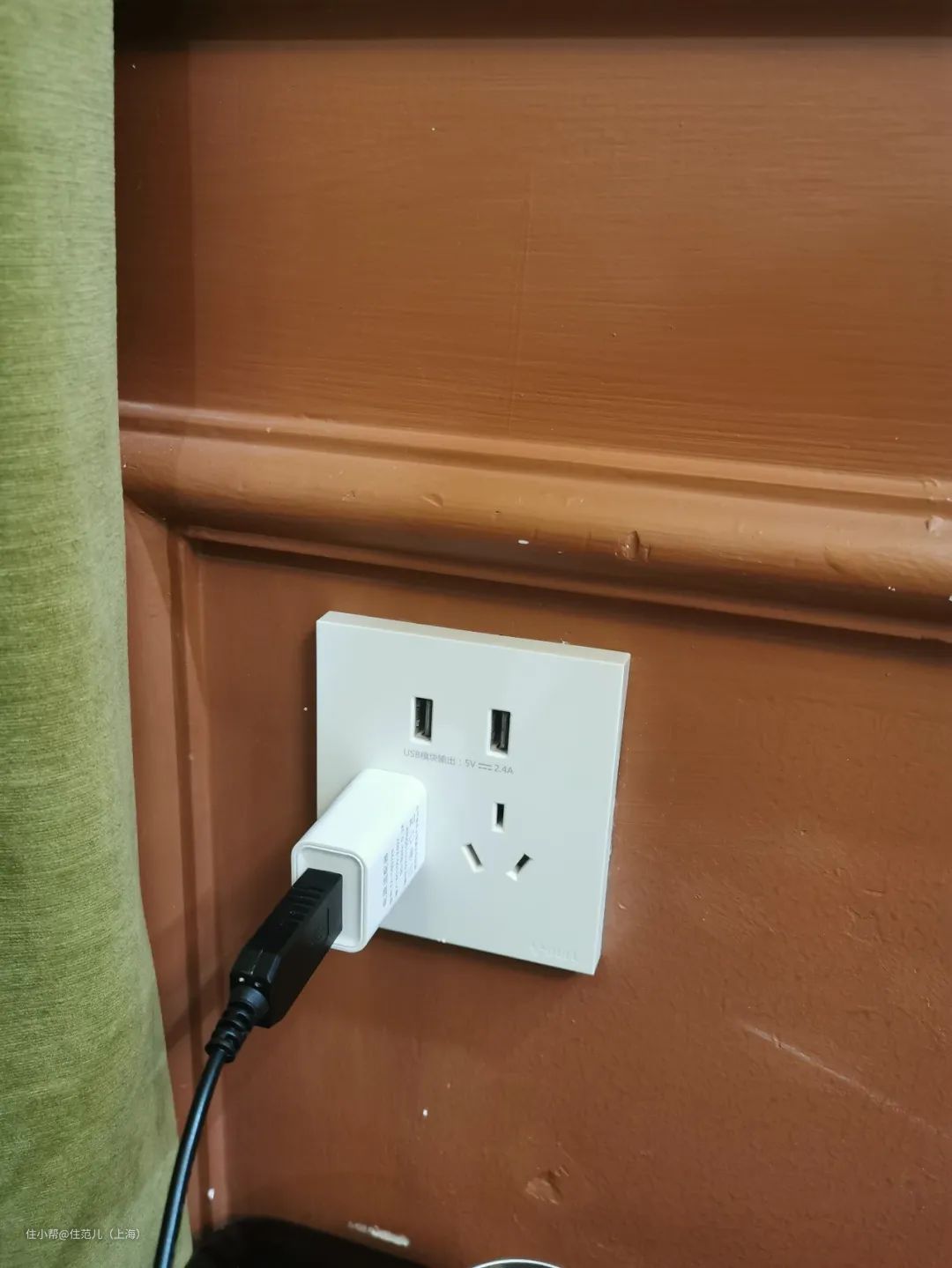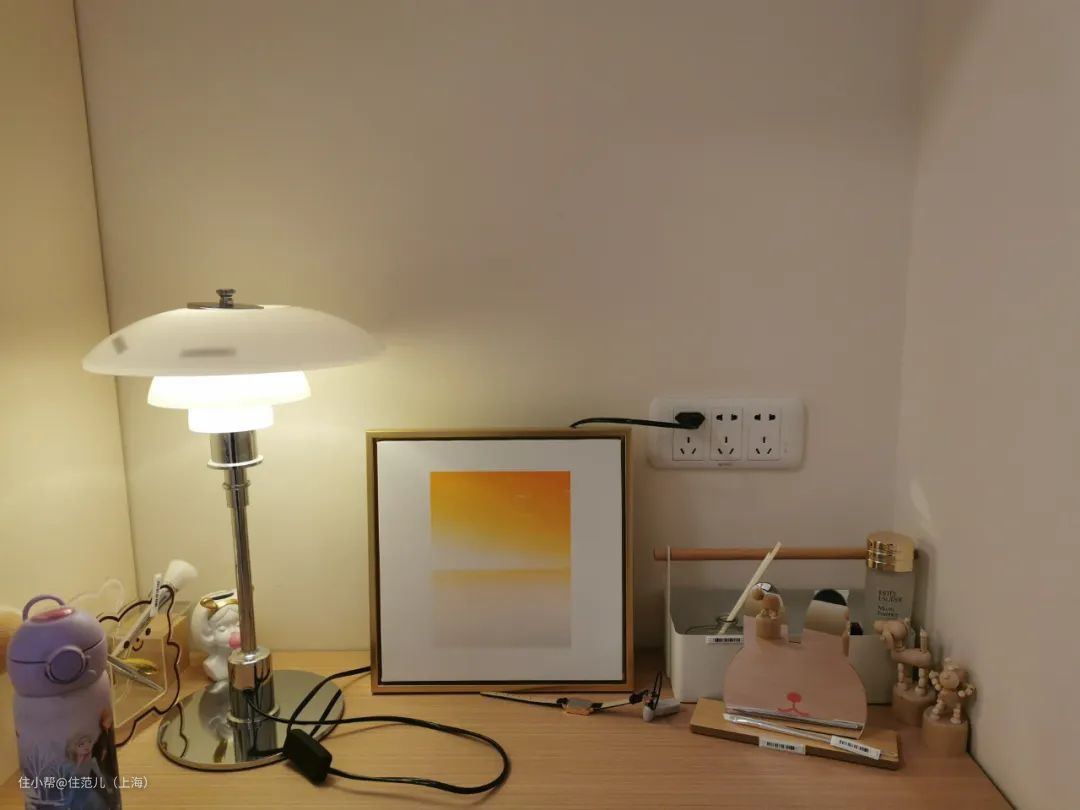 主卧床头插座少,还是五孔插座,加湿器、台灯、手机充电不能同时用,没办法,只能在插座上又加了一个移动插座。