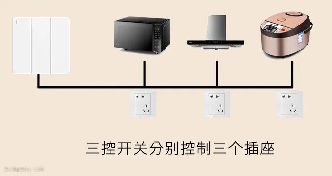 也可以用一个多控开关,同时控制几个家电的插座,开关位置可以随意布置,省钱还更方便。