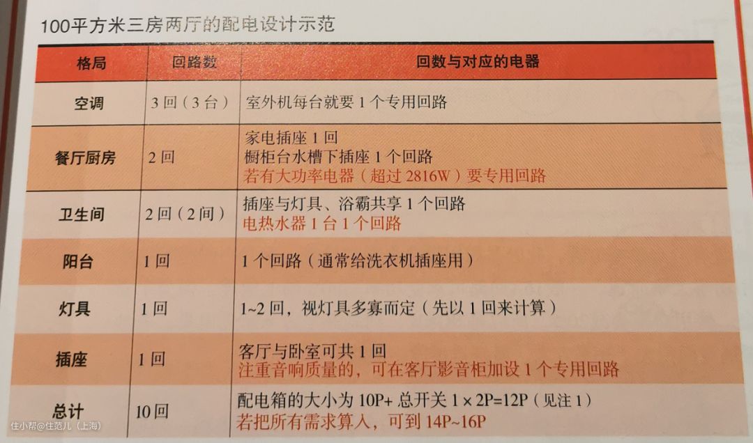 大家可以参考《这样装修不后悔》里面的回路设置,先把自己家的电器都列出来,不要忽略浴霸、挂烫机等小家电,越详细越好。
