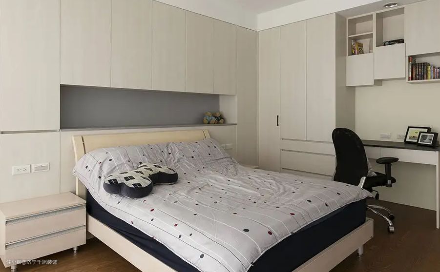 部分柜体“悬空”,悬空可以让柜体有一种轻盈的视觉感,不会显得很笨重,就算是小房间,对于这种方式也比较适合,通过尺寸的掌握,我们不仅可以在拥有丰富收纳空间的同时,还可以拥有床头柜、床头灯等功能区。