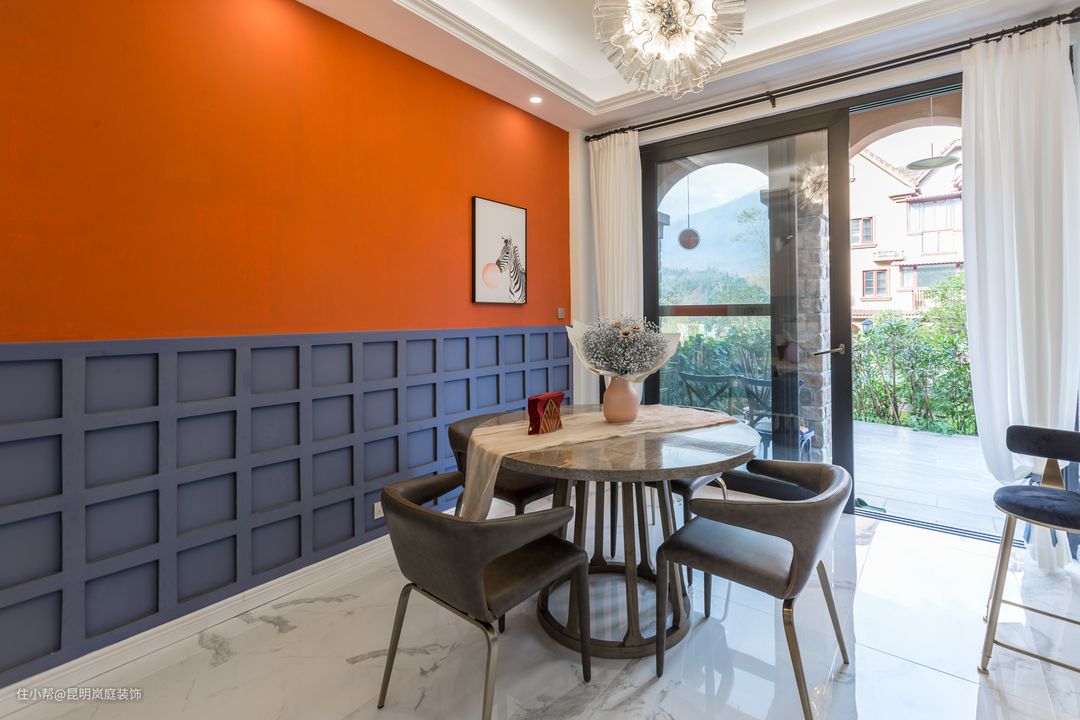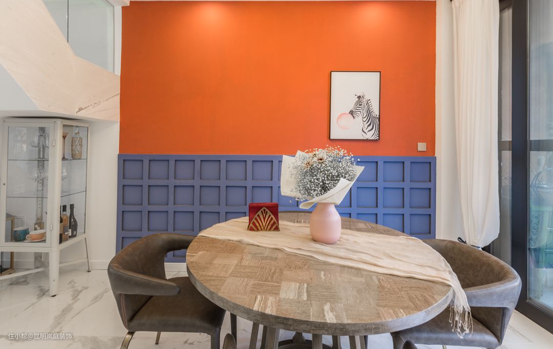 餐厅的背景墙也很出色,首先墙面延续了客厅的橙色背景墙,不过却是在这基础上增加了特别的蔚蓝色,利用色彩的强烈对比突出层次感。