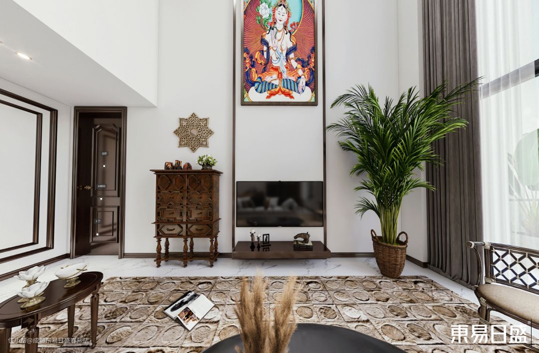 匆匆一眼,占据视觉C位的是造型优雅别致的电视背景墙,微水泥墙面加上客户私人唐卡做点缀。简约的时尚灯,世界被披上了优雅浪漫的晚礼服,下方的白色沙发、优美软凳配上中东独有的地毯,带你进入中东的世界。