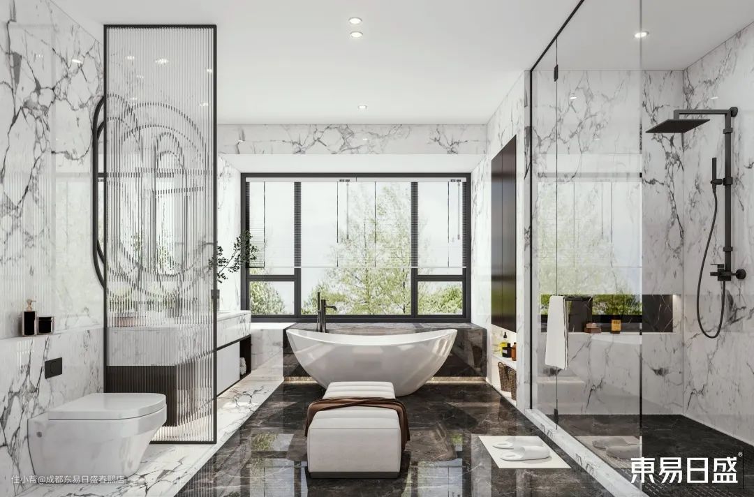 说到中东还想到就是——“豪”,纸醉金迷的中东生活,跑车、黄金、石油、珠宝等等都是中东的代名词,那么卫生间设计师直接全屋通铺大理石瓷砖,纯粹白的配色,堪比一个客厅大小的卫生间区域,中部是犹如鹅卵石的浴缸,流线型的线条极具审美感官。