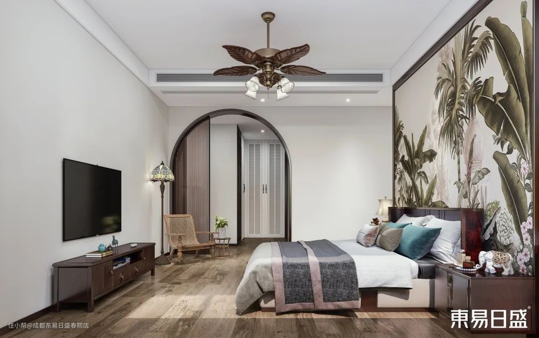 沙漠绿洲是中东独有的风景线,这种形式也受到设计师们的瞩目,著名的小说《天方夜谭》中多次描写到墙外茫茫沙漠,墙内人间仙境。它真切的把掘住人们对港湾渴望,所以主卧后方加入了一大片棕榈树的植物装饰画。