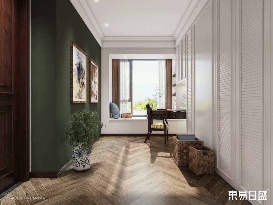 书房区域的地面采用了人字拼接接近大自然的气质,后面墙面拼接了祖母深绿打造浓厚的风格,阿拉伯风格的打造也离不开色彩鲜艳的祖母绿、天蓝色、金黄色等等充满色彩冲击的高饱和色彩。