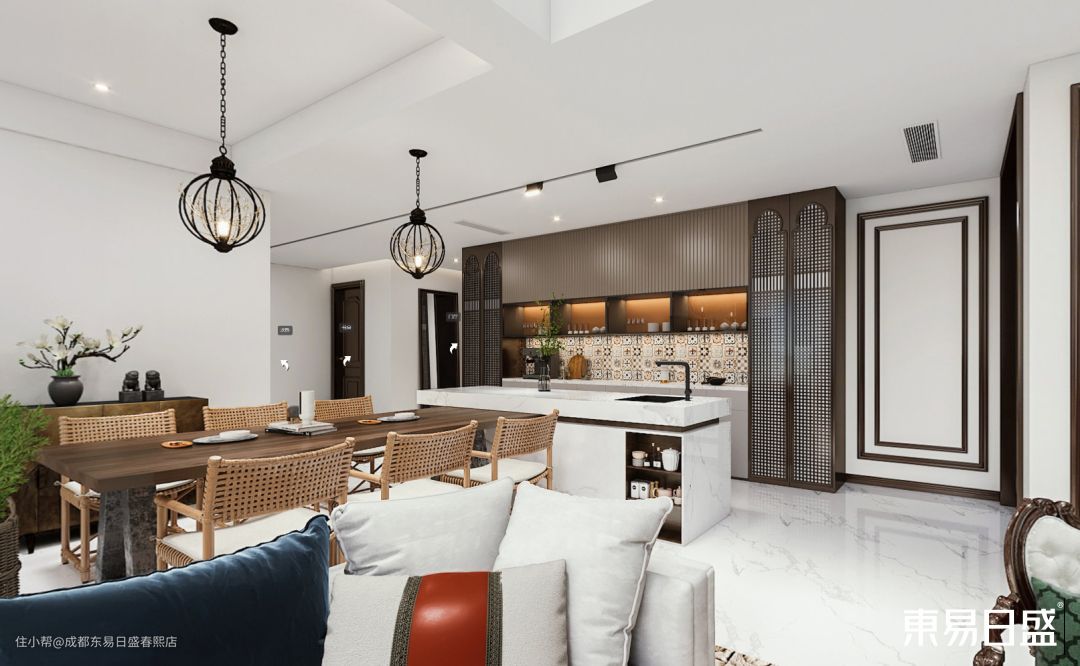 本期业主是一对年轻夫妇,家里有小孩。客厅是挑空空间,设计师利用挑高做出了适合娱乐休闲的会客区。客厅后面做餐厅和用屏风隔出来了一个品茶区,餐桌和西厨岛台形成一个T形,做了两个套房和一个书房,书房做上翻床,功能布局更为完善。