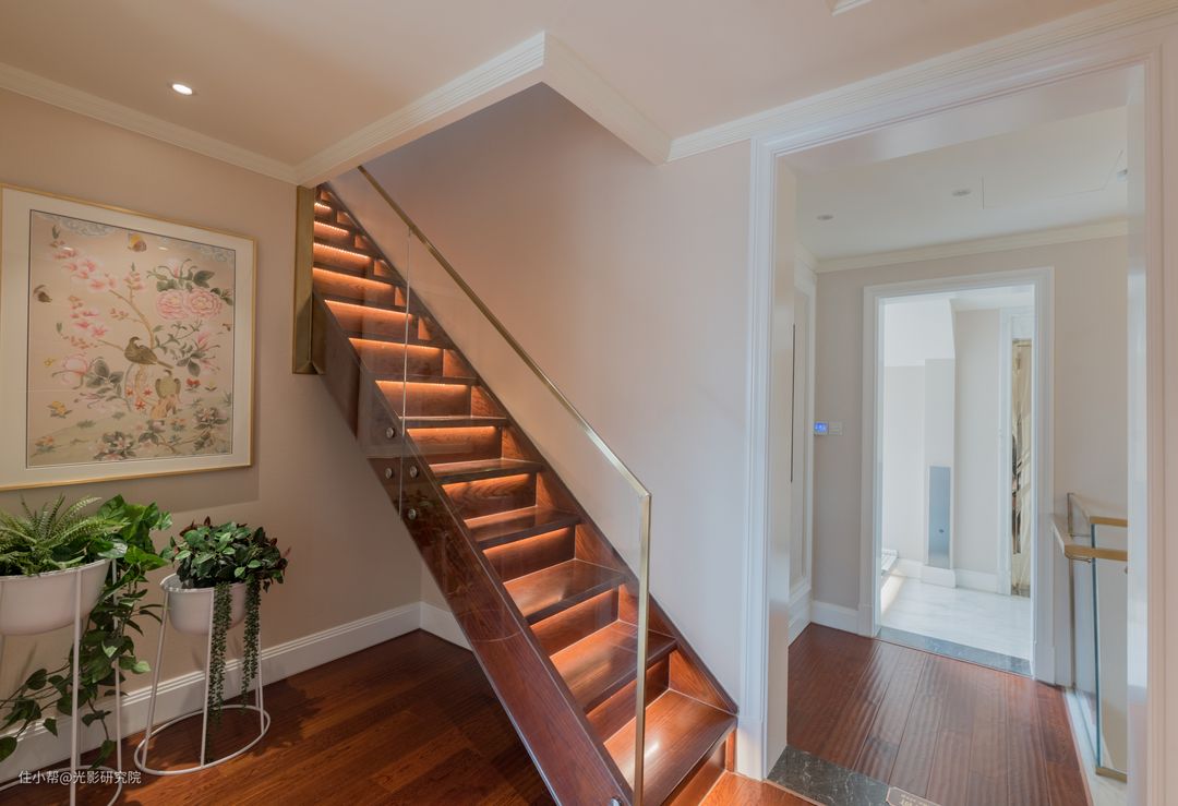 用灯光丰富楼梯的设计不仅仅让空间看起来很时尚,保证安全性也是我们强烈推荐的一大重要因素。隐藏灯带保证了充足的光线,减少意外事故的发生,还不会占用太多空间哦!