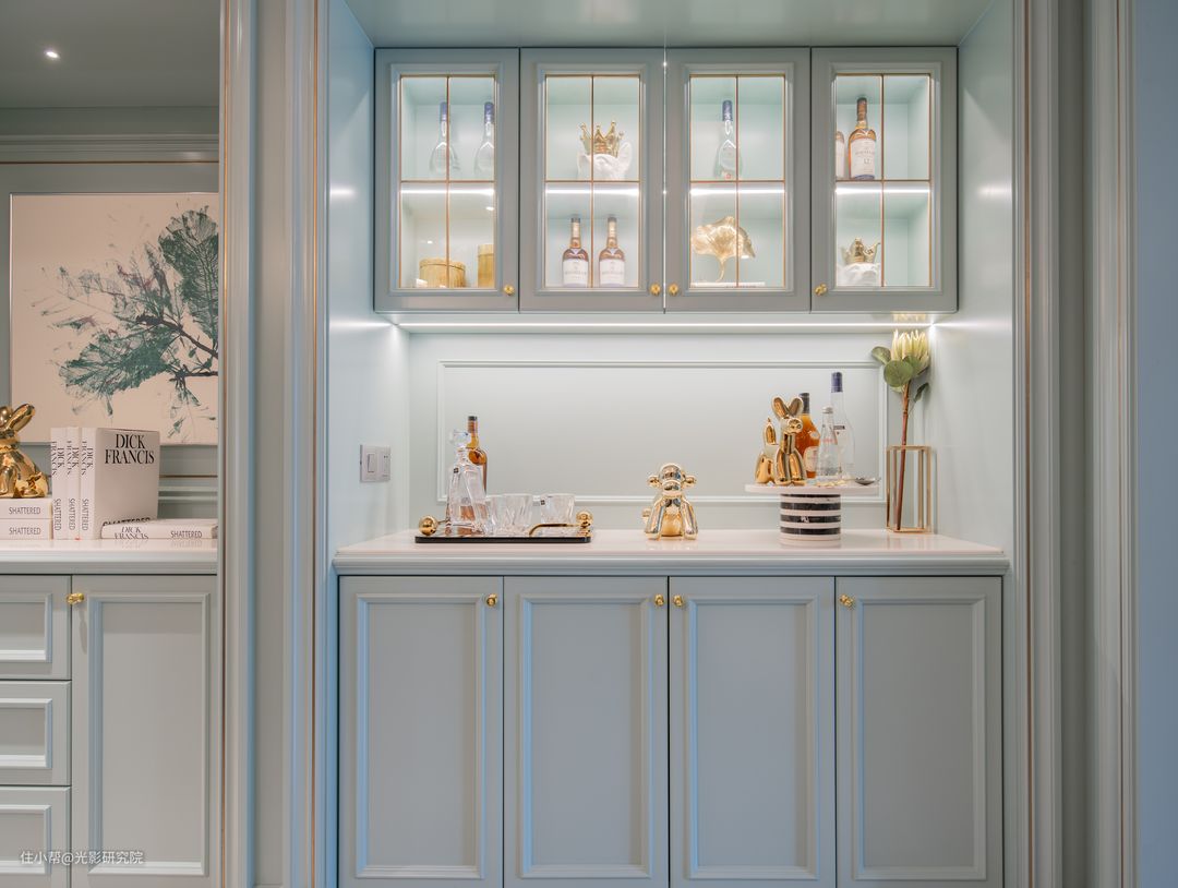 在橱柜中添加灯光可为它们带来珠宝盒般的效果,即使是简单的日常用品也显得容光焕发。并且,它还增加了一个有趣的光层,让你的家居变得更加具有立体感,生动有层次。