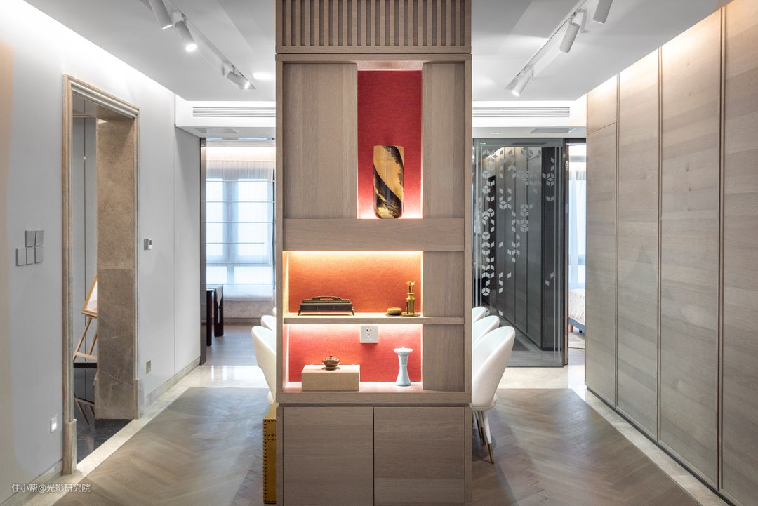 带有玻璃窗的储物柜更会加强这种秩序感与陈列感。筒灯或隐藏灯带让物品在“盒子”里面显得格外精致。打开柜门时,有一种拆礼物的错觉。