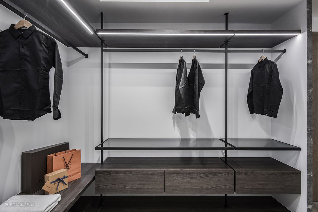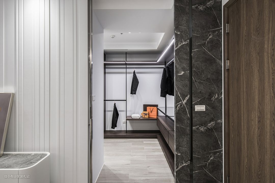 因为衣帽间串连着卧房与卫浴,于是所有门洞开口皆采用隐藏门手法,维系整体视觉和谐性,并以吊架式开放衣柜,缓解过道上的局促感。