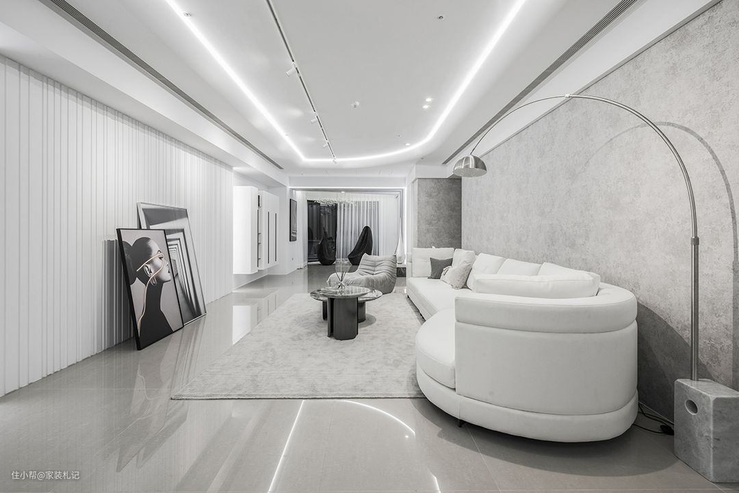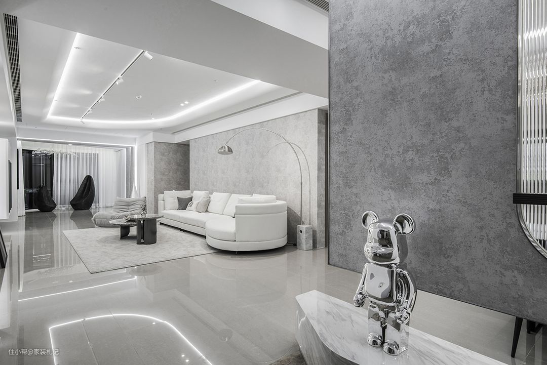 圆弧语汇相续而入,有天花的弧线、钓鱼灯的曲度,也有家具的流线,瞬息柔软了灰、白、银色所架构的景色;电视墙也以波浪立面系起领域的连续性,再由精细木作铺陈疏密线条,运用进退面与间接光定位主景所在。