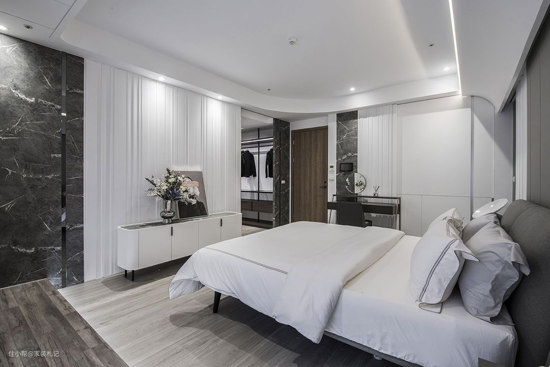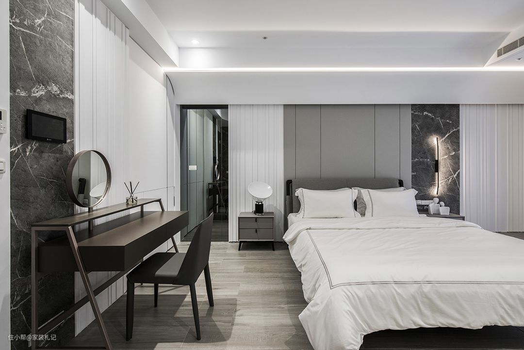 面的层次变化架构了卧房基调,是床头上方遮梁修饰,以斜面和弧角层层迭起立体性;是地面高低之分,用深浅木地板拉近与户外露台的距离;是异材质穿插展开的床头墙,选镜面、石纹、线条板和灰绷布排列丰富点缀。