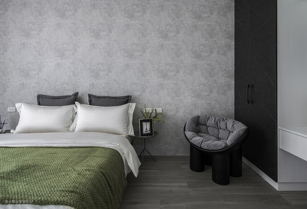另一间次卧,则相对内敛轻盈,显现出本身房型方正优势,也凸显出主牆镘刀手工抹痕。