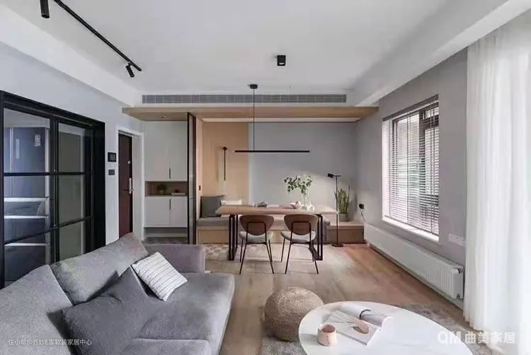 客餐厅一体,紧邻阳台区域,光影循大面窗台,恣意洒落于温润木地板,与灰度壁面舞出一片生动自然。