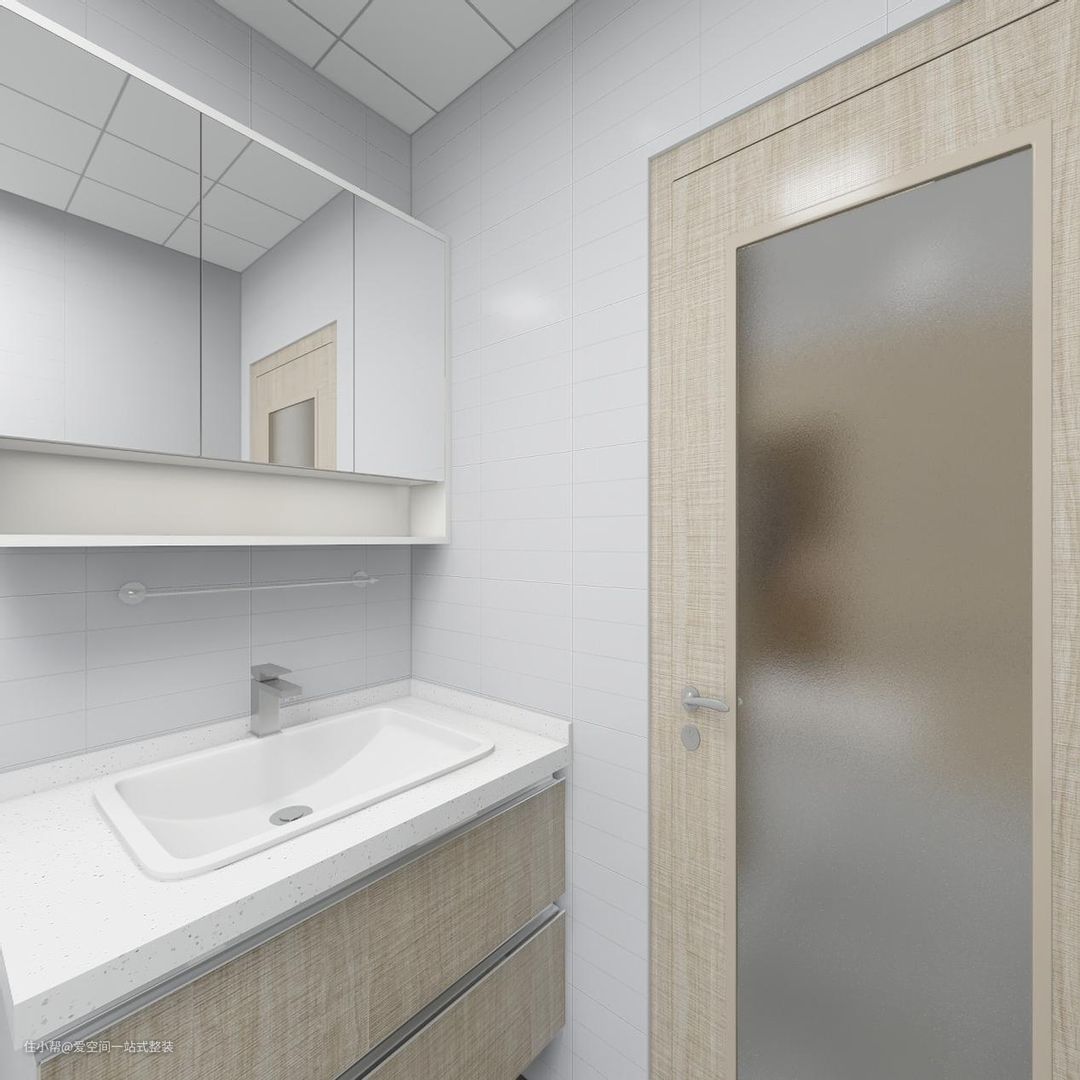 卫生间干区主要是马桶区和洗漱区,洗漱区由浴室柜和壁挂式镜柜组合构成。镜柜比较实用,壁龛式收纳洗漱物品,方便拿取,下面是毛巾架,洗完脸轻松拿取。离地式设计,不留卫生间死角,方便打扫。