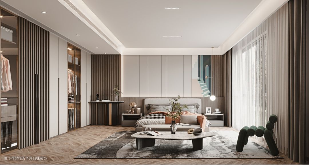主卧空间作为业主的睡眠空间,在沿用深棕色条纹元素,保证了空间风格统一的基础上,更注重营造温暖感,保证业主的睡眠质量。地面使用木质地板,给卧室定下温和自然的空间基调。毛茸茸的地毯,脚感十分舒适,能在触觉上给人更加放松的感受。在床品的选择上,使用了纯棉材质的床单被罩,和皮肤接触时,更加温暖亲肤,能十分有效的提高业主的睡眠质量。
