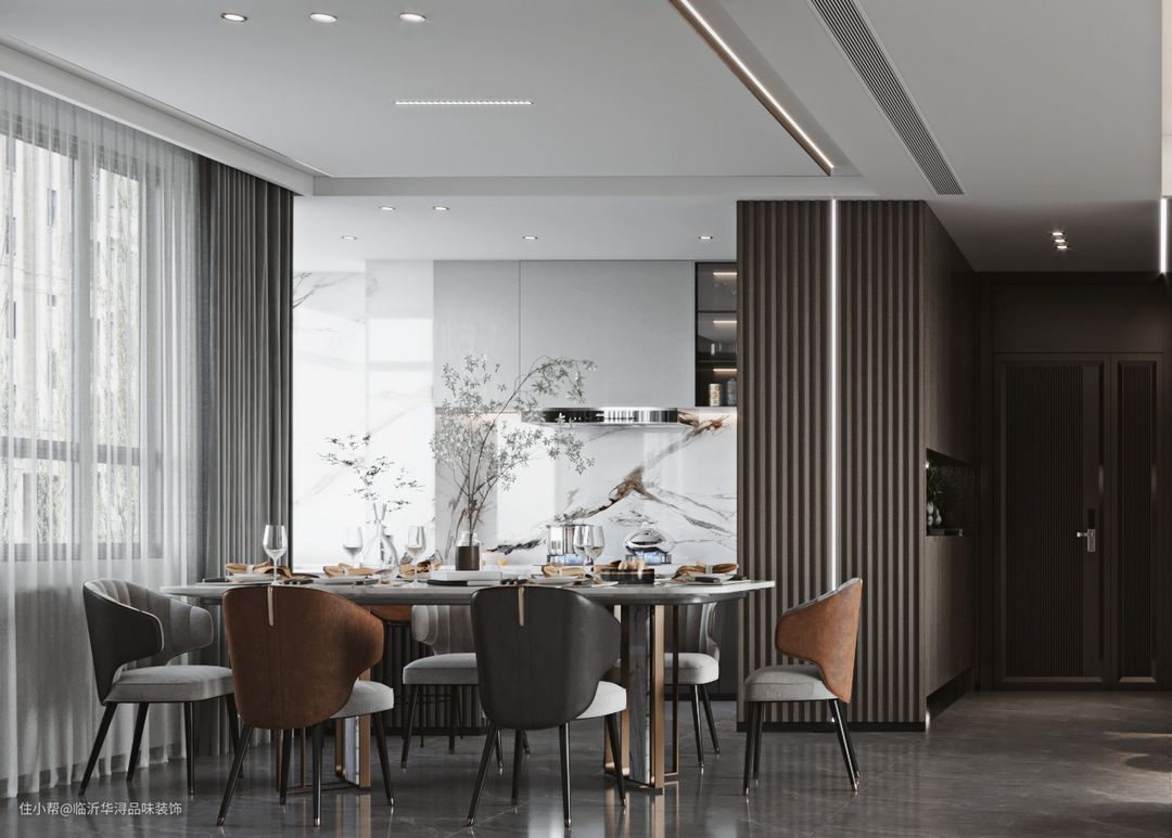 餐厅沿用了客厅深棕色元素,并使用这种元素在墙壁上做出条纹护墙板造型,统一了整个房间的风格。在竖条灯带的烘托下,现代气息强烈。同时凹凸有致的造型增强了餐厅空间的层次感。在家具的选择上,无论是石材与金属拼接的餐桌还是简洁造型的餐椅,无不透露出现代风格特点。另外,选用了几把带有橘红色椅背的餐椅,让餐厅看上去更加温暖,更符合用餐环境的要求。