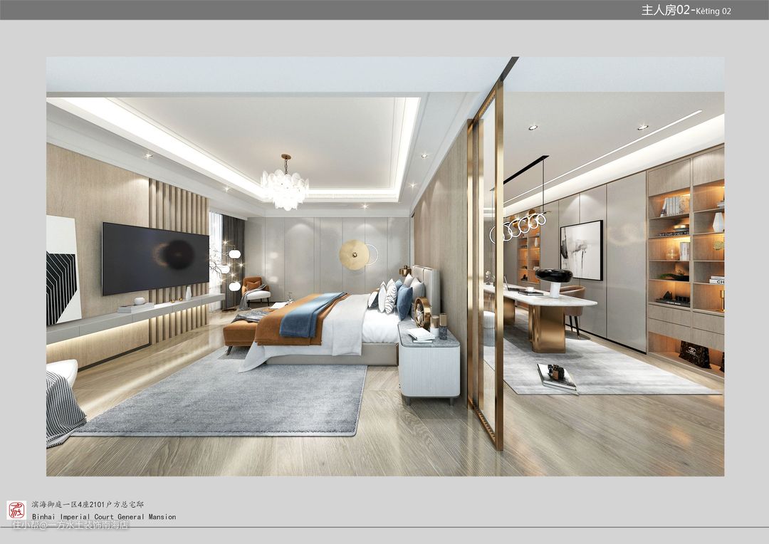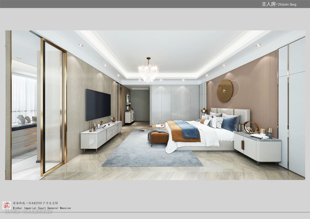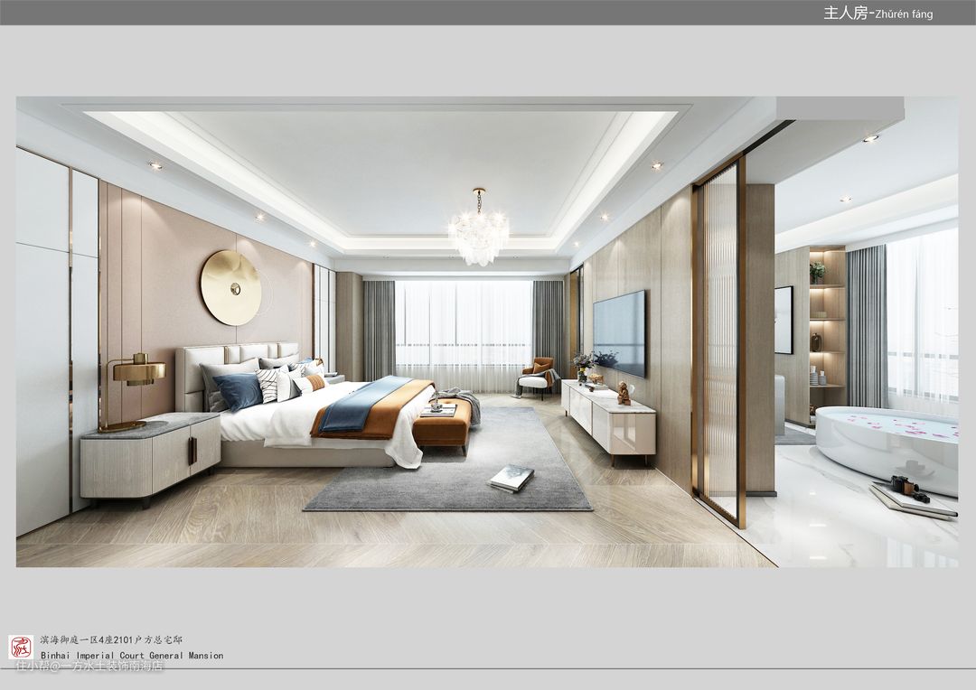 大面积的空地窗与造型羽毛般轻盈的主灯,绒面地毯,床头圆形金属面的装饰物,彰显房主奢雅的装饰品味,开放玻璃推拉门增加左右两边生活互动感