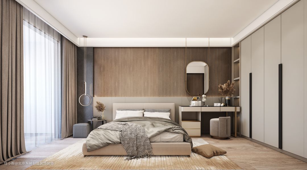 卧室将梳妆台与床头柜结合,整体木色与暖白色柜体做对比,黑色岩板点缀,体现亲近自然暖色色调的情感。超多的储物空间分门别类,满足男主人和女主人的收纳,同时柜体化整为零,增加柜体的完整性,不凌乱。