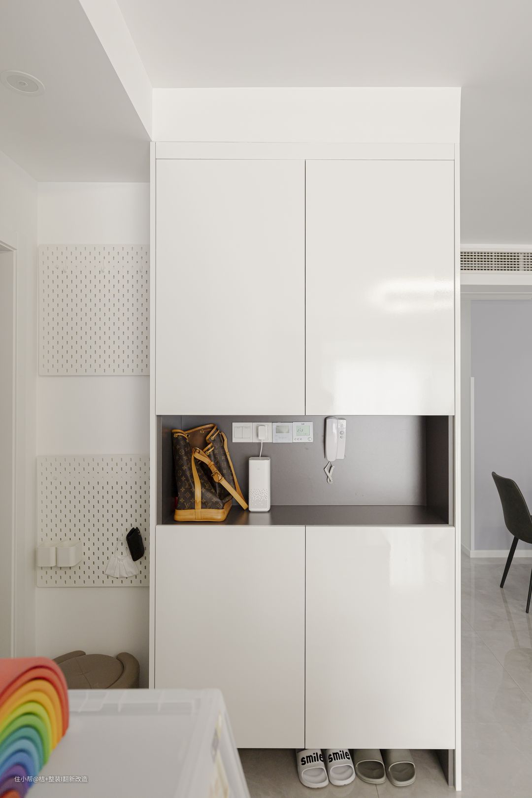 鞋柜靠门一侧,预留一张换鞋凳,上方搭配两个洞洞板,可以挂衣服、帽子