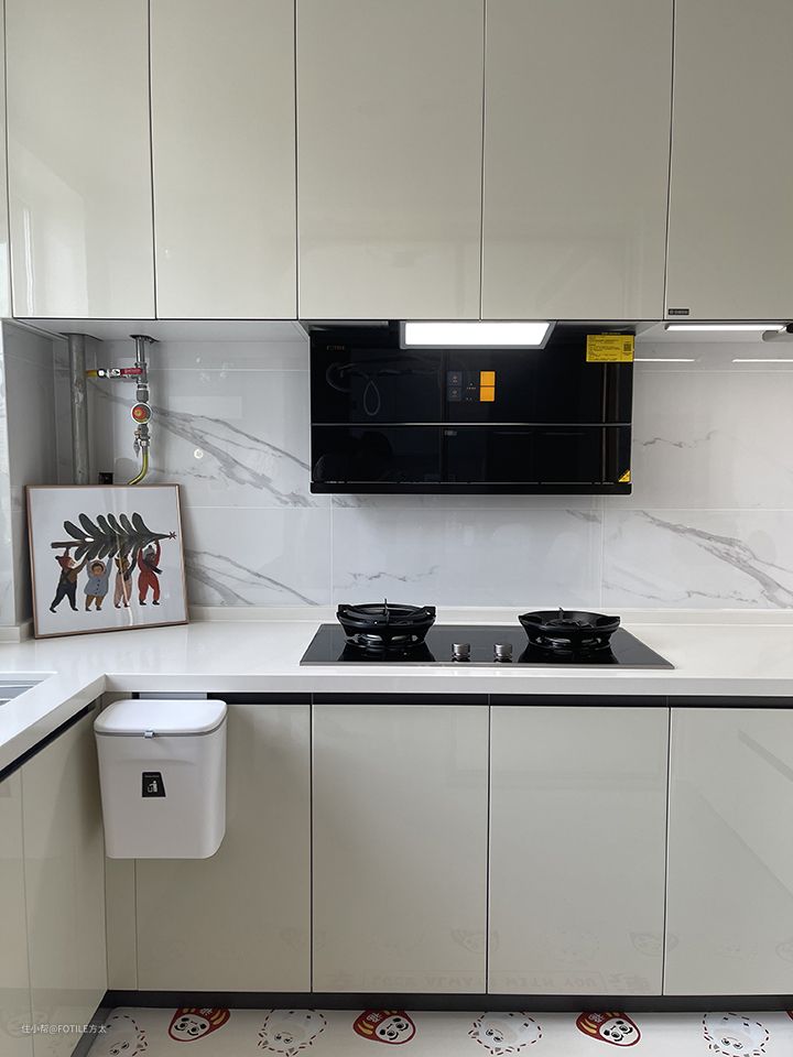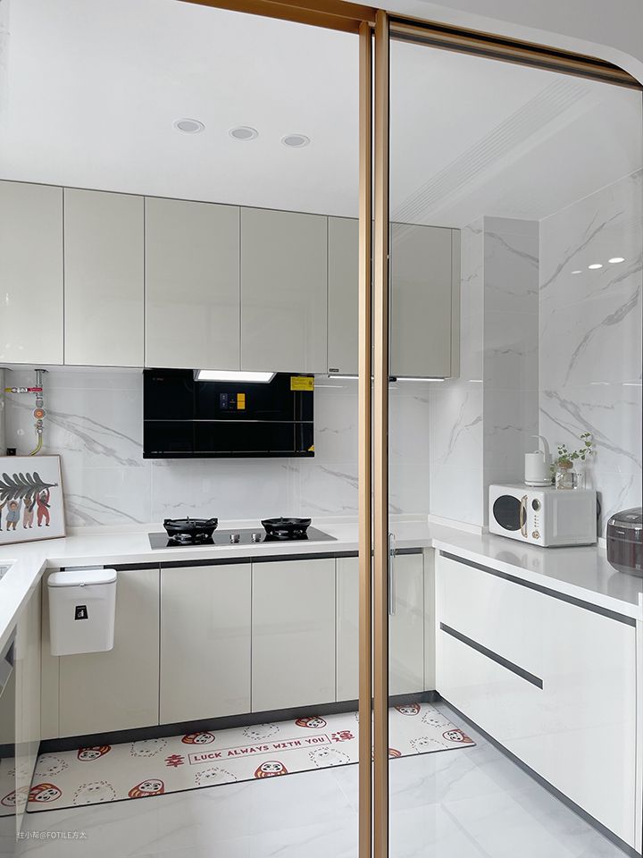 菜菜在她新家的厨房里就大胆选择了奶油白的橱柜搭配白色石英石的地面与墙面,碰撞出可爱又不失个性的厨房调性。金属边框的玻璃移门增加了这个空间的高级感,也让油烟最大程度不要飘散到厨房之外的地方。