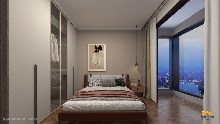 主卧的设计轻奢、典雅,没有太多华丽繁杂的装饰,温润的原木地板搭配浅色系的乳胶漆墙面和吊顶,简单却不单调;宽敞的落地飘窗不仅增大了采光面积,窗外的美景更能缓解业主一整天的疲惫。