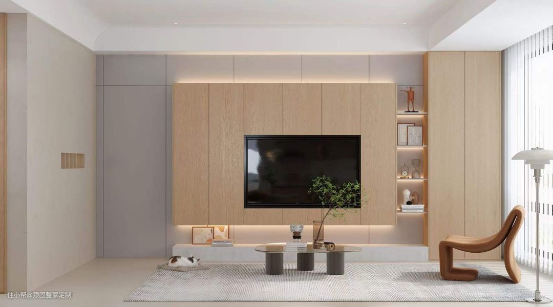 秉承着家居美学“少即是多”的空间概念,客厅没有过量的装饰,大量留空,一门到顶的柜体让收纳空间大大提升,以“极光灰”竹香板悬挂式电视背景墙做色调分离,搭配隐藏式灯带营造出温馨的家,氛围感拉满。