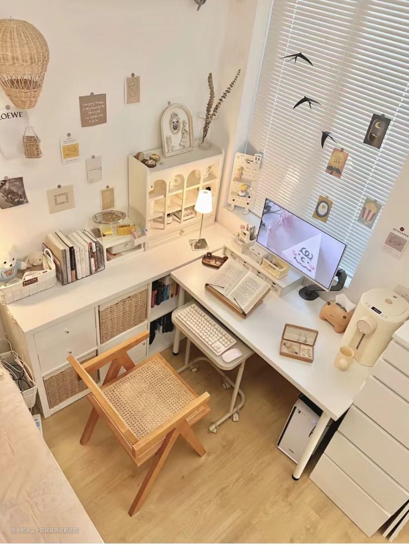 电脑增高架配上小收纳盒,可以收纳常用的笔、胶带、便签纸等。好看又精致的杯架,杯子和香薰都可以放,还有抽屉收纳茶包。八格柜收纳书本,配上抽屉、小门、藤编筐,收纳杂物看起来也不会乱。书桌边上的六屉柜,可以收纳化妆品、首饰、衣服等。