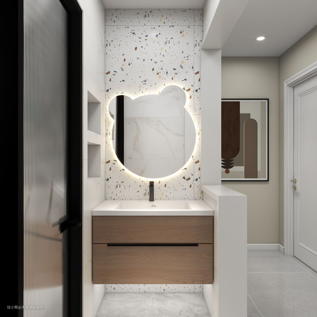 卫生间干区以半墙形式展现,体现了通透性。旁边的墙重新建,左右两边各上下镂空,满足储物空间需求。