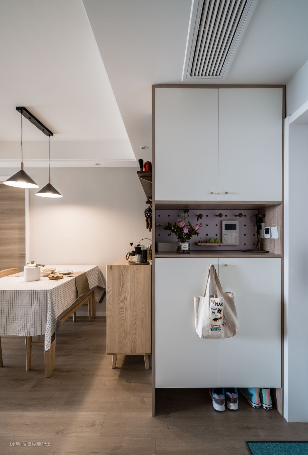 靠墙做了一组原木白玄关柜,底部悬空方便放鞋子,中间的开放区置入了洞洞板,方便挂钥匙等一些小物件