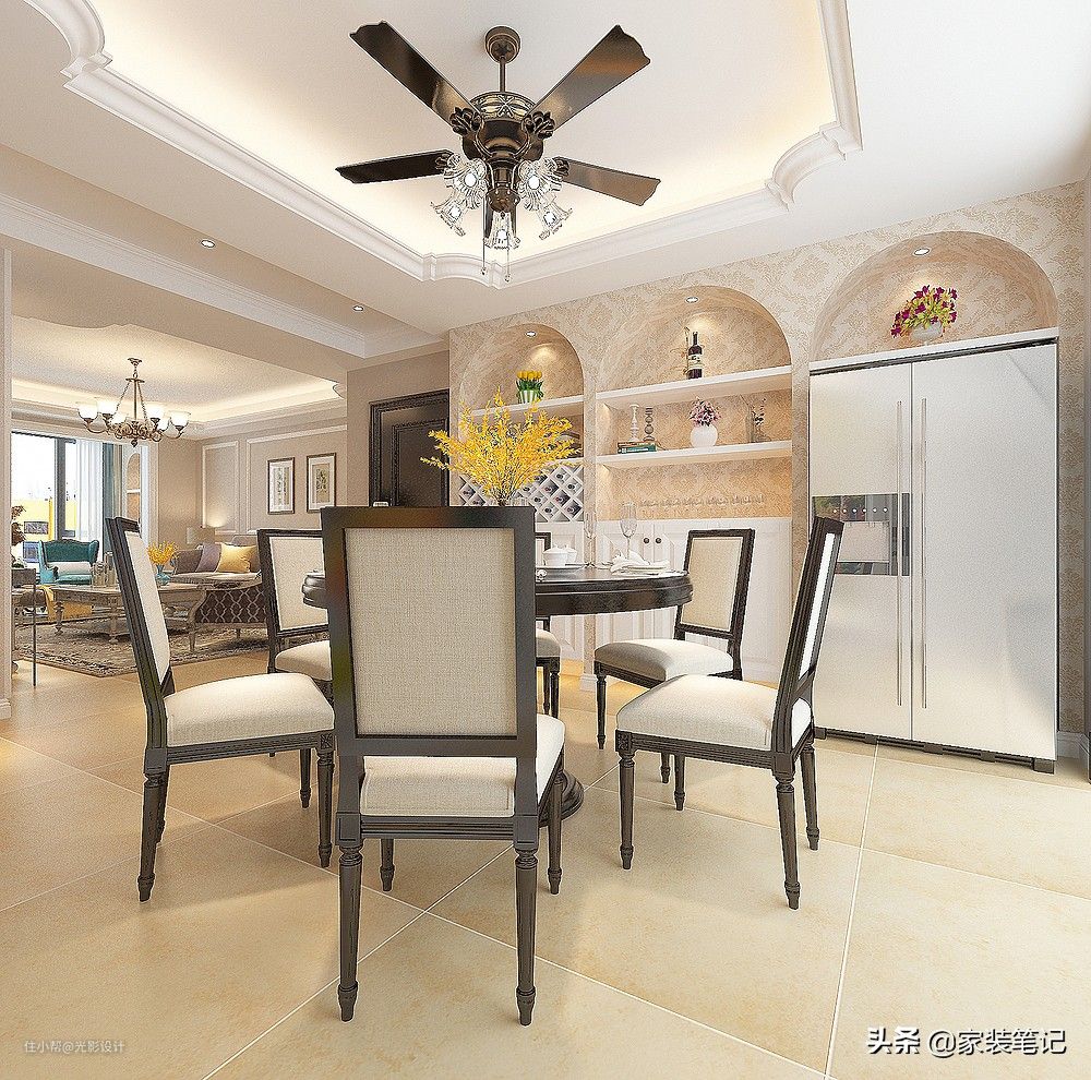 餐厅的酒柜视角,传统的美式弧形造型用得比较多,这样更能够体现出它不一样的美感和特色。双开门的冰箱嵌入到一组柜子里面,其实是凸出来的,这里是视角的问题,看上去是平的。